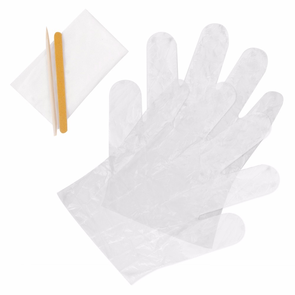Luva higiênica descartável com hidratante. Acompanha lixa e palito descartáveis.